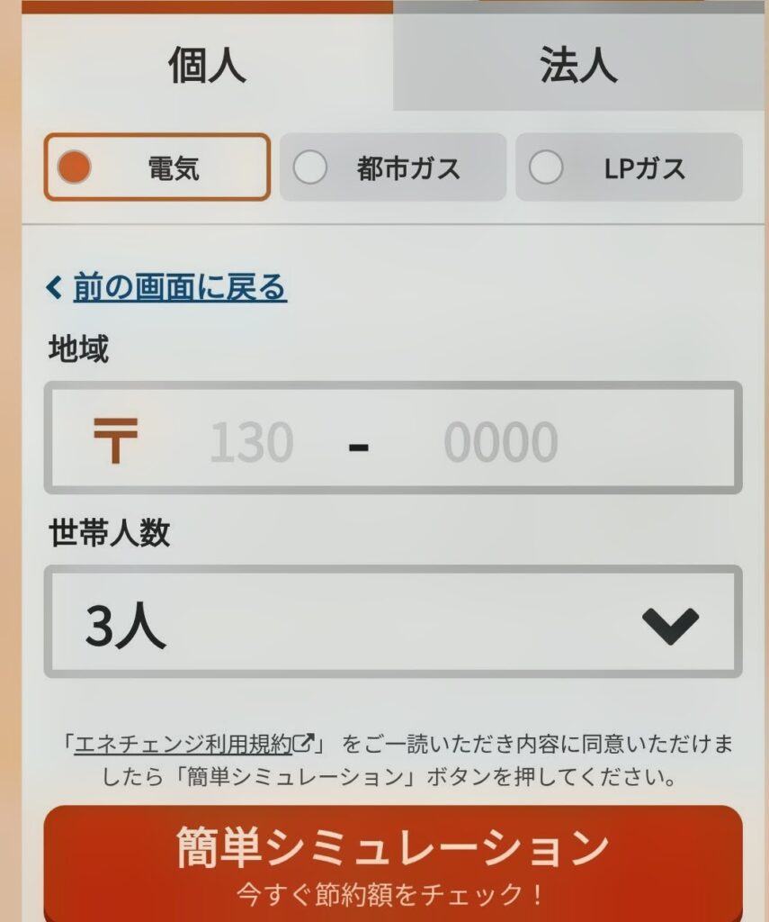 郵便番号と世帯人数を入力し、「簡単シミュレーション」というところをタップすると